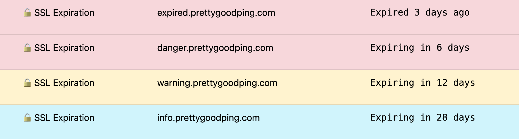 By now you have enough information to be dangerous when it comes to finding and monitoring TLS/SSL certificate expiration dates. You can run the above script via a cron or even embed some of the logic into a pluggable monitoring system. If all of that seems to be too much, prettygoodping.com is available to you as an easy option as well.